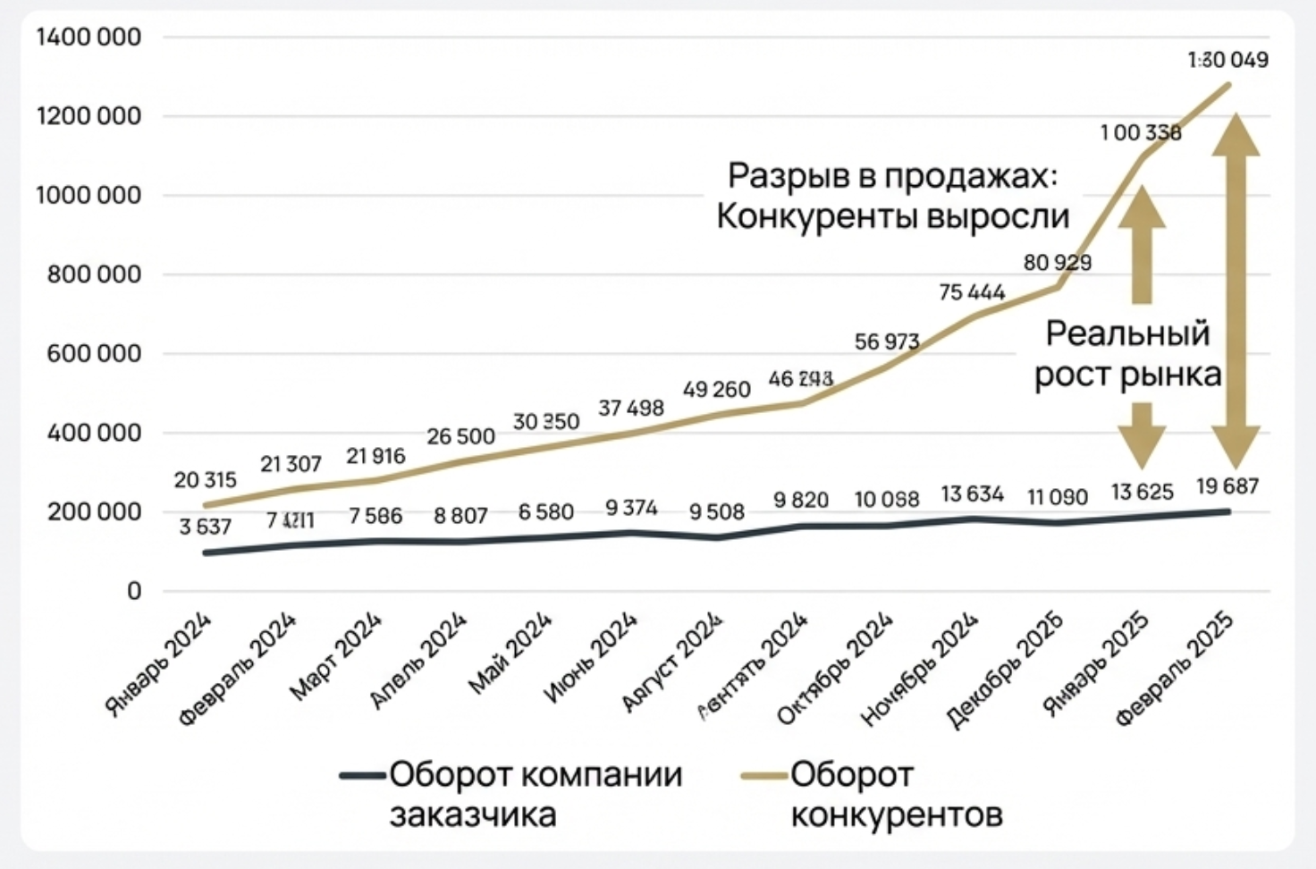 Реальность данных: рынок вырос на 20% к прошлому году, а объём продаж в январе и феврале у конкурентов превысил показатели 2024 года